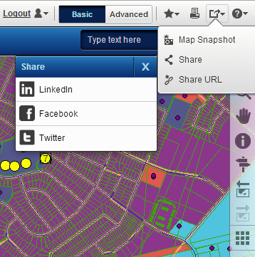 If social networking sites have been enabled for the map, you can post links to the map to those sites to share with individuals in your social network. Map links can include selections, search results or markup.By default, links are active for seven days. After the expiry date, the map links are still valid but any selections or markup will not be displayed on the map.