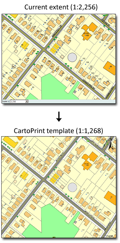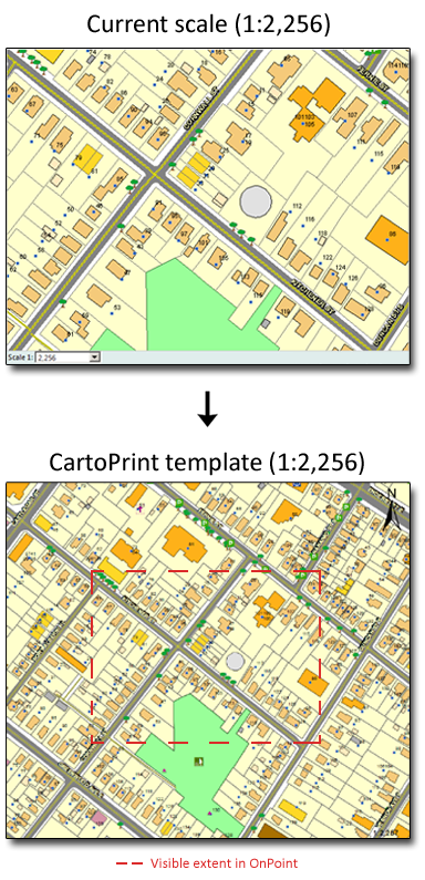 • The top right column in Figure 40 shows a map as it is displayed in OnPoint in a web browser, and the bottom right shows the same map as it would display in print as a result of selecting this option. Notice the area covered in both is the same but that the scale becomes larger in print. Specify the scale at which you want the map on the printout to be shown.