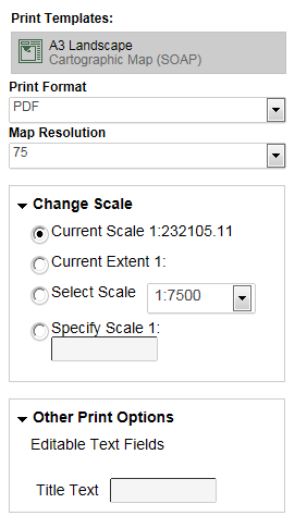 5. Expand the Change Scale section and select a scale from one of the options. By default the scale of the map to be printed is the same as the currently displayed map.