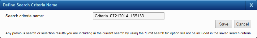 If the map administrator has enabled this feature, you can specify criteria for a search and save it to run a search with that criteria at a later time. This feature is particularly useful in searches containing many fields. In addition, if your administrator has enabled profiles, any search criteria you save are automatically associated with your profile. If you do not create a profile, any search criteria you save is associated with the default profile, which is visible to everyone. See