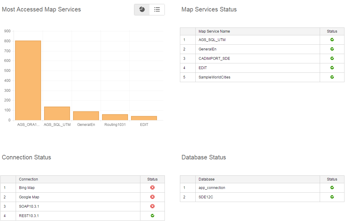 System Health The System Health section provides an overview of statuses of connections to map services, connections and databases along with the statistics related to most accessed map services. The connection status are depicted by the icons and that represent successful and failed statuses respectively. Figure 86 An example of reports displayed in the System Health section